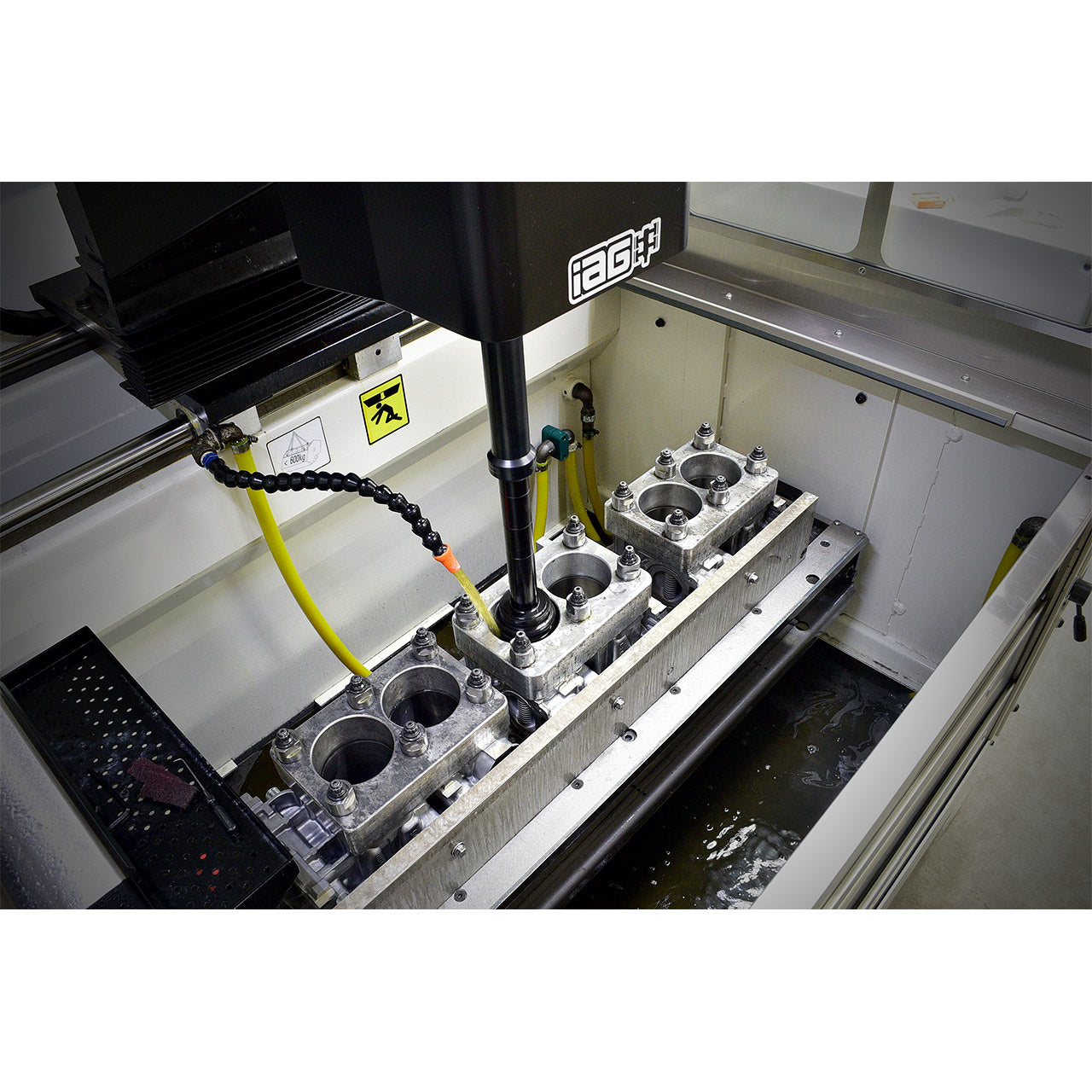 It's no secret that the OEM Subaru case halves, or "block," aren't exactly the strongest. IAG has developed a process to greatly improve the strength of the OEM Subaru EJ20 Case Halves to combat the effects of high cylinder pressures brought on by increased power and boost. Our proprietary "Closed Deck" System works by supporting the top of the cylinder in the weakest areas and prevents movement and expansion which can lead to cracks and failures. Despite the additional material supporting the cylinder walls, there is no concerns with overheating or coolant flow because the area around the middle of the cylinder still maintains the same coolant area. The custom IAG closed deck inserts are machined with holes for oil and coolant to pass through the same as stock. If you're one of those people who prefer to do your own builds we now offer our legendary closed deck case halves for purchase separately. Simply install your crank, rods, and pistons to your own specifications and be confident that the case halves will take the power and prevent common cylinder wall failures. The IAG Closed Deck conversion is performed 100% in-house by our engineers and experts using state-of-the-art equipment. The IAG Closed Deck starts with a new OEM EJ20 bare case. The case is loaded and fixtured to a 4th axis rotary indexer in our Haas VF4-SS CNC Vertical Machining Center. It is supported by the main journals using a precision ground 2-inch bar and tailstock which ensures the datum is the main journals. This method gives us a true reference point to perform all machining operations. A Rennishaw probe is utilized to check that the case is fixtured true, and once confirmed the machining process begins.