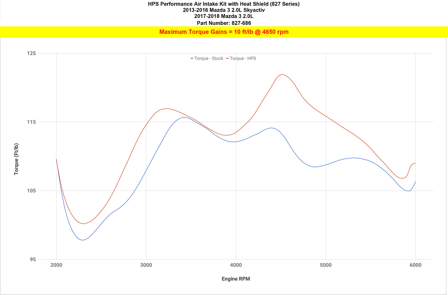 Description_MKT | The All-New HPS Performance 827 Series Air Intake Kit (Blue, Part # 827-686BL) for 2013-2018 Mazda Mazda3 2.0L Skyactiv offers a free-flowing 3 inch mandrel-bent aluminum tube induction system designed to produce dyno proven performance gains +10 Whp horsepower, +10 Ft/lbs torque and improve throttle response while maintaining safe air fuel ratio. The heavy duty powder coated steel heat shield integrates with the factory fresh air scoop to direct cold air to the air filters for the best cooling effect. The included installation manual has clear pictures and instructions to guide the installer throughout the whole process. The kit does NOT require tuning and does not trigger CEL light. No modification is required during the installation. HPS light weight mandrel-bent aluminum alloy tubes replace the stock restrictive air box and optimize the air flow with long lasting durability. HPS Performance 827 Series air intake kit features race proven reinforced silicone hoses and industrial grade 100% stainless steel T-bolt clamps which ensures reliability, even during the most extreme driving conditions. The All-New HPS Performance Air Filter is designed with performance in mind, delivering excellent filtration without sacrificing air flow. All HPS Performance Air Filters are made in the United States. |