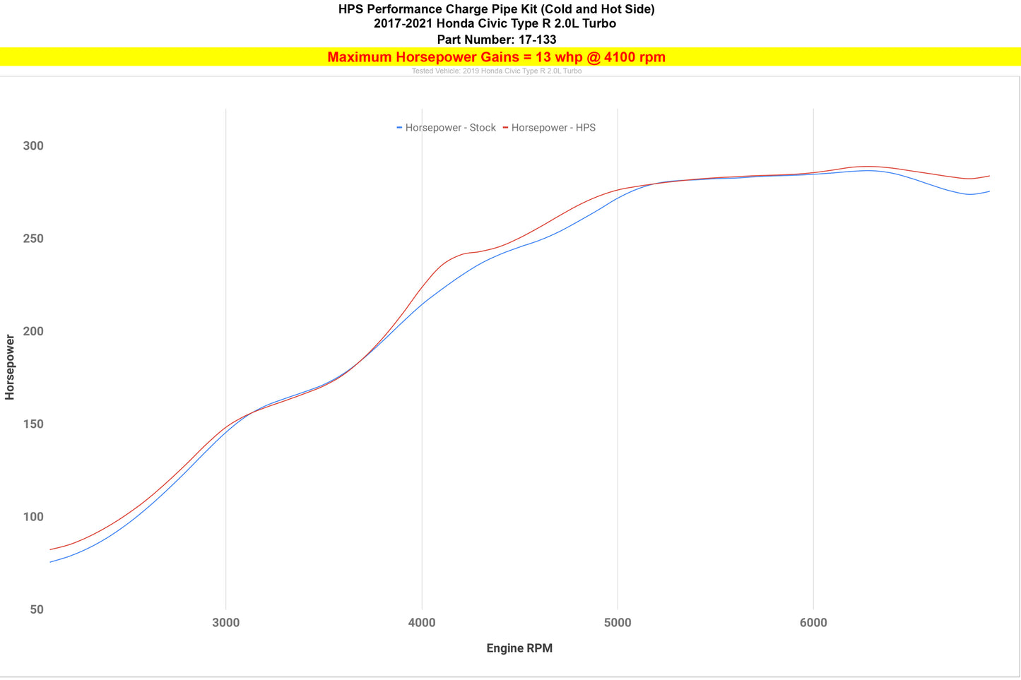 Description_MKT | The HPS Performance Charge Pipe Kit, part number 17-133, is a high-quality aftermarket upgrade designed specifically for the Civic Type R. This kit is engineered to replace the factory charge pipe system, providing significant performance improvements for your vehicle. With a larger 2.5-inch diameter on the cold side and a 2.25-inch diameter on the hot side, the enhanced airflow and reduced restriction increases the engine output by 13 horsepower and 16.6 lb-ft of torque, resulting in improved throttle response, acceleration, and overall engine performance.Constructed with durability in mind, the HPS Performance Charge Pipe Kit is made from 6061 mandrel-bent aluminum to withstand high temperatures and pressure levels, delivering long-lasting performance and resistance to cracking or leaking even under the most demanding driving conditions. To facilitate the installation of sensors and other accessories, a 1/8" NPT bung is included into the design of the upper cold-side charge pipe.In addition to the enhanced performance, the HPS Performance Charge Pipe Kit also offers improved reliability. The included 4-ply reinforced oil resistant silicone couplers and embossed stainless steel hose clamps ensure a secure and leak-free connection. These couplers are designed to handle high boost pressures, resist degradation from oil, and provide excellent heat resistance while the stainless steel hose clamps offer a tight fit that prevents slipping or loosening.This kit is designed to be a direct bolt-on replacement, making installation straightforward and hassle-free. All the necessary hardware and components are included, ensuring a proper and secure fit. With its larger diameter charge pipes, durable construction, and included oil resistant silicone couplers and stainless steel hose clamps, this kit offers improved throttle response, increased horsepower, and a more exhilarating drive with the HPS Performance Charge Pipe Kit installed in your Civic Type R. |