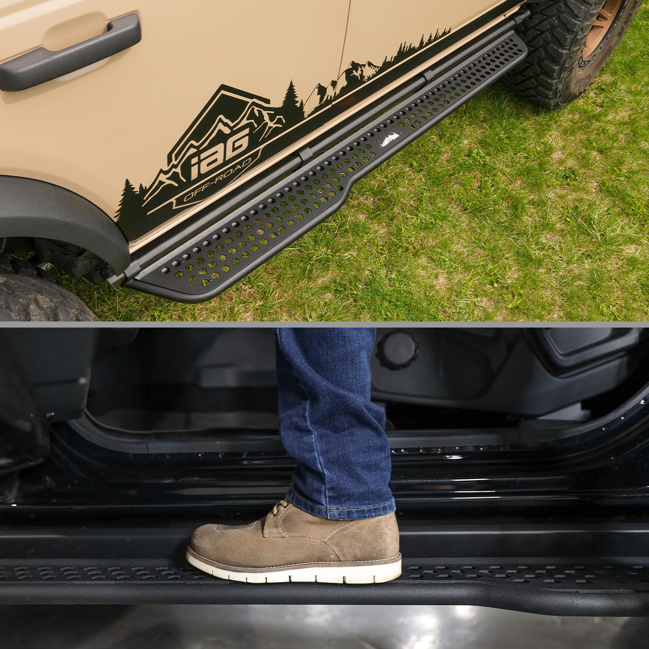 Stepping in and out of the new Ford Bronco can be a bit of a challenge for some, especially if the vehicle has been lifted. Whether you or one of your family members need a little boost, the IAG EZ-Step System provides just the solution to make getting in and out easy. The EZ-Step Full Length Bronco Side Step System is designed to mount to the OEM Ford rock rails found on many 2021 through 2023 Bronco models. The full-length design matches the length of the OEM rock rail and provides a wider section for rear passenger entry. The simple two-bolt installation takes a few minutes and does not require drilling or cutting.