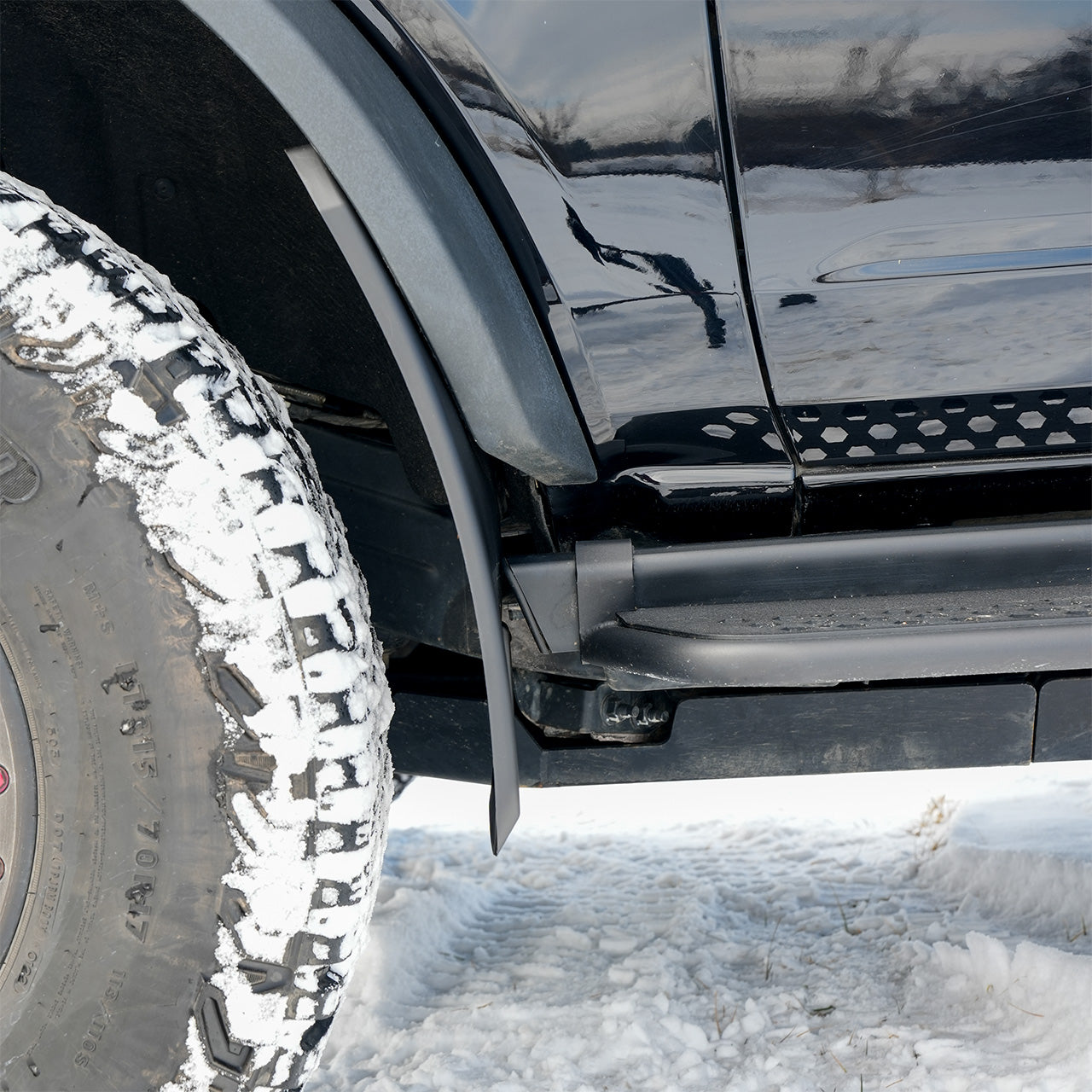 IAG Off-Road builds products with real-world feedback in mind, and the IAG Bronco Trail Shield Mud Flaps are no exception. We've packed in the best design features to ensure maximum protection for all 2021+ Ford Bronco trims, including Heritage and Everglades models. Built tough in the USA, the patent pending IAG Bronco Trail Shield Mud Flaps stand up to snow, mud, rocks, and debris—no matter where the road or trail takes you. The IAG Bronco Trail Shield Mud Flaps surpass ordinary mud flap designs with innovative features and versatile fitment options. Sold as a complete set for the right and left front and rear wheel wells, they feature an adjustable width to fit both narrow (non-Sasquatch) and wide (Sasquatch) fenders while remaining fully compatible with Sasquatch package wheels and tires. They’re designed to work with all OEM running boards, side steps, rock rails, and even OEM crash bars, making them a seamless addition to any 2-door or 4-door Bronco. Whatever your setup, these mud flaps have you covered.
