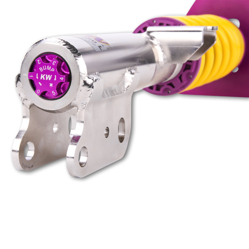 Designed to maximize the performance on vehicles with DOT-R and other ultra high-performance tire setups. KW V3 Clubsport coilovers are the ideal choice for double-duty street cars, use at HPDE's(high performance drivers education), time attack or time trials, and club level racing. The Clubsport setup was specially designed on the Nordschleife and the continuous adjustable ride height allows for fine corner weight or making setup changes. The TVR-A and TVC-A valve technology -provide an unmatched level of separately adjustable damping for the rebound and compression enabling a customized set up appropriate for the vehicle's modifications such as weight, tire characteristics, and other various conditions. The KW V3 Clubsport INOX-LINE coilover kit is the ideal tool for performance-oriented drivers and experienced tuning enthusiasts who place a strong emphasis on the overall performance of their suspension. The KW V3 Clubsport features patented TVR-A and TVC-A technology -hat provides separately adjustable rebound and compression damping. The extensive Adjustment -angle of the independently configurable rebound and compression make it easy to directly influence the steering behavior, directional stability, grip and handling characteristics for confident and repeatable results at the limit of driving dynamics.