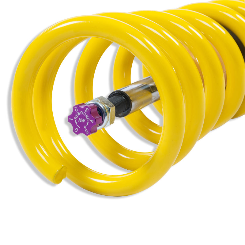 Cutting-edge motorsports technology for more performance on the road. Like every suspension product developed by KW automotive, the suspension manufacturer, and manufactured in Germany, the KW V3 Coilover suspension kit also provides a significant plus in safety reserves in road traffic. Thanks to the chassis with its high-quality dampers, springs, and elastomer spring elements, pitching and rolling movements during load changes such as evasive maneuvers, cornering, acceleration, and braking are significantly reduced. The braking distances are also shortened. Thanks to improved support and feedback, drivers not only feel safer but driving in everyday life becomes even safer. With compression and rebound stage damping, that can be set separately and independently of each other, the damper setup can be customized to your personal driving preferences or vehicle changes such as weight, tire characteristics, or altered vehicle rigidity. True perfo rmance optimization is only possible with this unique, patented system. For example, this allows the compression damping force to be increased and get more grip from the tires, to improve cornering behavior and reduce squat without simultaneously altering the rebound stage damping which is optimally matched to the spring rate, a scenario which results in reduced grip and the associated loss of performance. The KW V3 coilover kit is the ideal tool for performance-oriented drivers and experienced tuning enthusiasts who place a strong emphasis on the overall performance of their suspension. The Variant 3 features patented TVR-A and TVC-A technology that provides separately adjustable rebound and compression damping. The extensive adjustment range of the independently configurable rebound and compression make it easy to directly influence the steering behavior, directional stability, grip and handling characteristics for confident and repeatable results at the limit of driving dynamics.