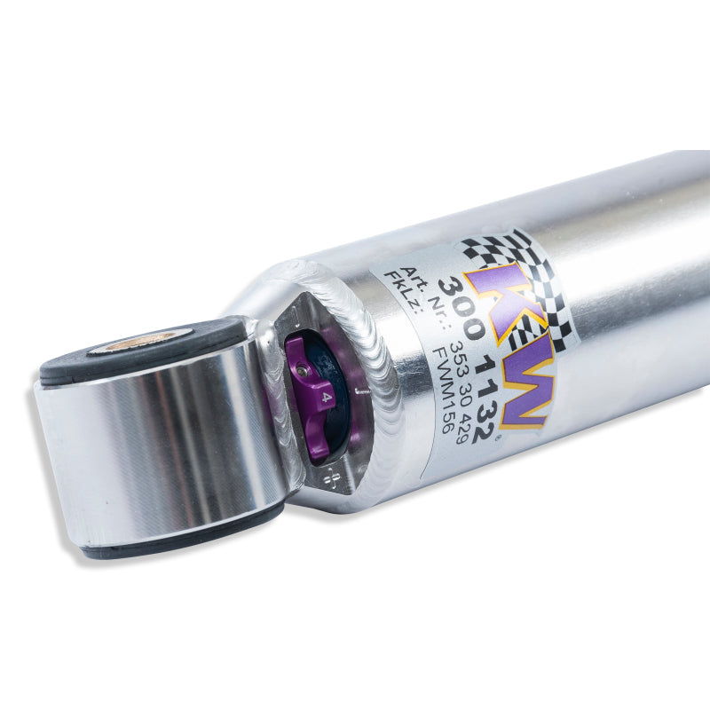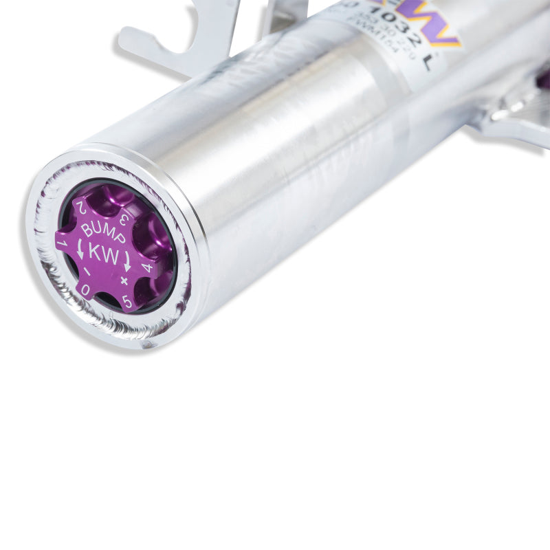 Cutting-edge motorsports technology for more performance on the road. Like every suspension product developed by KW automotive, the suspension manufacturer, and manufactured in Germany, the KW V3 Coilover suspension kit also provides a significant plus in safety reserves in road traffic. Thanks to the chassis with its high-quality dampers, springs, and elastomer spring elements, pitching and rolling movements during load changes such as evasive maneuvers, cornering, acceleration, and braking are significantly reduced. The braking distances are also shortened. Thanks to improved support and feedback, drivers not only feel safer but driving in everyday life becomes even safer. With compression and rebound stage damping, that can be set separately and independently of each other, the damper setup can be customized to your personal driving preferences or vehicle changes such as weight, tire characteristics, or altered vehicle rigidity. True performance optimization is only possible with this unique, patented system. For example, this allows the compression damping force to be increased and get more grip from the tires, to improve cornering behavior and reduce squat without simultaneously altering the rebound stage damping which is optimally matched to the spring rate, a scenario which results in reduced grip and the associated loss of performance. The KW V3 coilover kit is the ideal tool for performance-oriented drivers and experienced tuning enthusiasts who place a strong emphasis on the overall performance of their suspension. The Variant 3 features patented TVR-A and TVC-A technology that provides separately adjustable rebound and compression damping. The extensive adjustment range of the independently configurable rebound and compression make it easy to directly influence the steering behavior, directional stability, grip and handling characteristics for confident and repeatable results at the limit of driving dynamics.