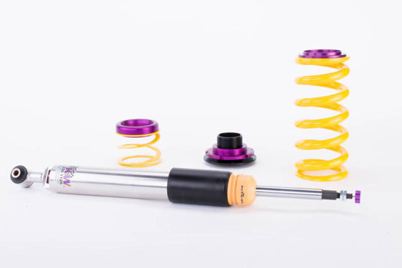 Cutting-edge motorsports technology for more performance on the road. Like every suspension product developed by KW automotive, the suspension manufacturer, and manufactured in Germany, the KW V3 Coilover suspension kit also provides a significant plus in safety reserves in road traffic. Thanks to the chassis with its high-quality dampers, springs, and elastomer spring elements, pitching and rolling movements during load changes such as evasive maneuvers, cornering, acceleration, and braking are significantly reduced. The braking distances are also shortened. Thanks to improved s upport and feedback, drivers not only feel safer but driving in everyday life becomes even safer. With compression and rebound stage damping, that can be set separately and independently of each other, the damper setup can be customized to your personal driving preferences or vehicle changes such as weight, tire characteristics, or altered vehicle rigidity. True performance optimization is only possible with this unique, patented system. For example, this allows the compression damping force to be increased and get more grip from the tires, to improve cornering behavior and reduce squat without simultaneously altering the rebound stage damping which is optimally matched to the spring rate, a scenario which results in reduced grip and the associated loss of performance. The KW V3 coilover kit is the ideal tool for performance-oriented drivers and experienced tuning enthusiasts who place a strong emphasis on the overall performance of their suspension. The Variant 3 features patented TVR-A and TVC-A technology that provides separately adjustable rebound and compression damping. The extensive adjustment range of the independently configurable rebound and compression make it easy to directly influence the steering behavior, directional stability, grip and handling characteristics for confident and repeatable results at the limit of driving dynamics.