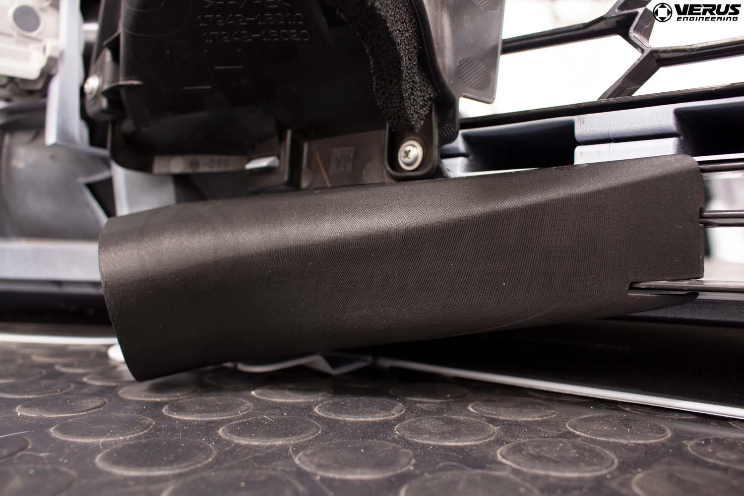 The Verus Engineering Full Brake Cooling Kit is configured in an OEM style format, with emphasis on the shortest route possible. Using a 3D printed carbon nylon inlet the bolts onto the factory bumper for fresh, high-pressure air and a stainless backing plate with a carbon duct, ducting air to the center of the rotor, this is the brake cooling kit to have. The kit comes with everything necessary for an install, including pre-cut hoses.