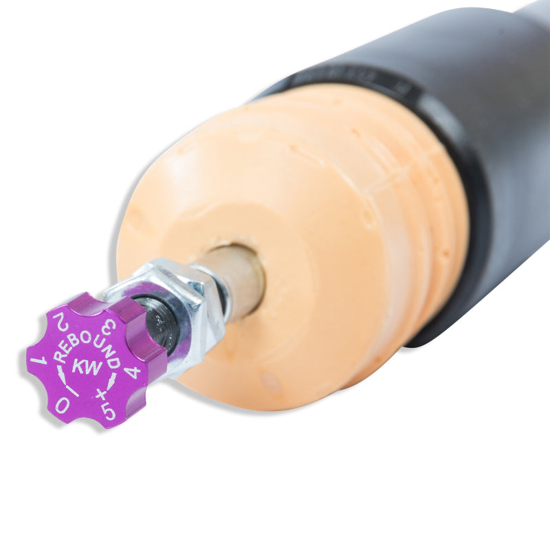 KW V2 INOX-LINE coilovers are the perfect solution for drivers who want more than just outstanding looks and adjustable ride height. In addition to stainless steel coilover struts, and corrosion-resistant components built for long term durability, KW V2 coilovers utilize TVR-A (Twin Valve Rebound - Adjustable) technology that allow Adjustment of the rebound damping characteristics with 16 clicks so you can fine tune the ride comfort or performance to your satisfaction. As with all KW coilovers our engineers develop vehicle specific damper settings that undergo comprehensive testing on the Nurburgring Nordschleife and in our KW 7-post Driving Dynamic Test Center. With a KW coilover kit the driving experience is more dynamic and direct. With the rebound adjustability you have a more direct influence on the handling or comfort of the car. With 16 precise clicks you can adjust the KW dampers (more firm or more comfortable) without affecting the compression damping fine-tuned by our engineers. The two-stage, patented TVR-A (Twin Valve Rebound - Adjustable) technology enables a small volume of oil flow through an adjustable, conically shaped, low-speed bypass during low damper speeds, while at high damper speeds, the main rebound stage valve opens allowing a larger volume of oil to flow. This provides a big improvement in terms of ride comfort without influencing the high-speed range. There are 16 precise clicks available for individual settings, so you can choose between more comfort or more body control. With KW V2 coilovers you can achieve maximum lowering within an approved lowering range that ensures a proper functioning suspension and adequate travel after your car is lowered. Even after years of use you can easily adjust the ride height thanks to the dirt resistant trapezoid thread and composite adjustment collar.